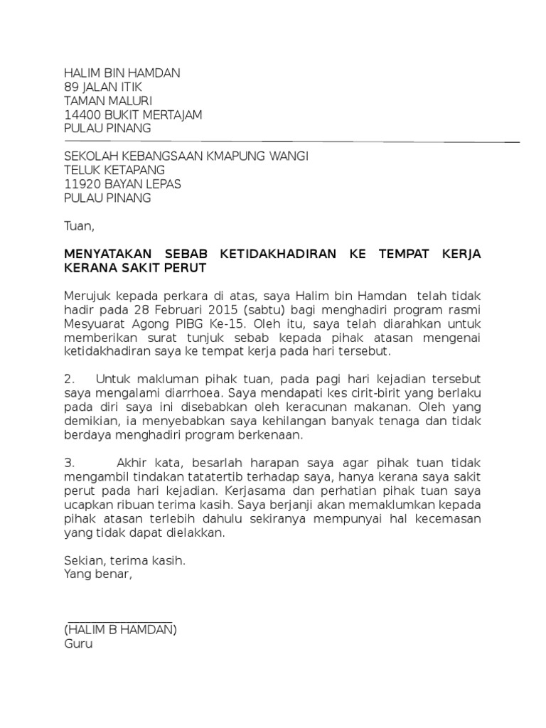 Surat Tunjuk Sebab Tidak Hadir Sekolah Surat Tidak Hadir Ke Sekolah Koleksi Contoh Pelbagai Alasan